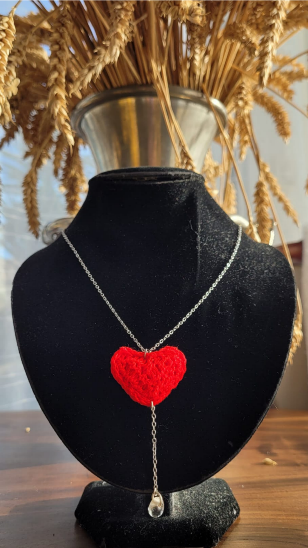 - Motif : cœur crocheté avec chaîne fine de 4 cm et perle goutte cristal